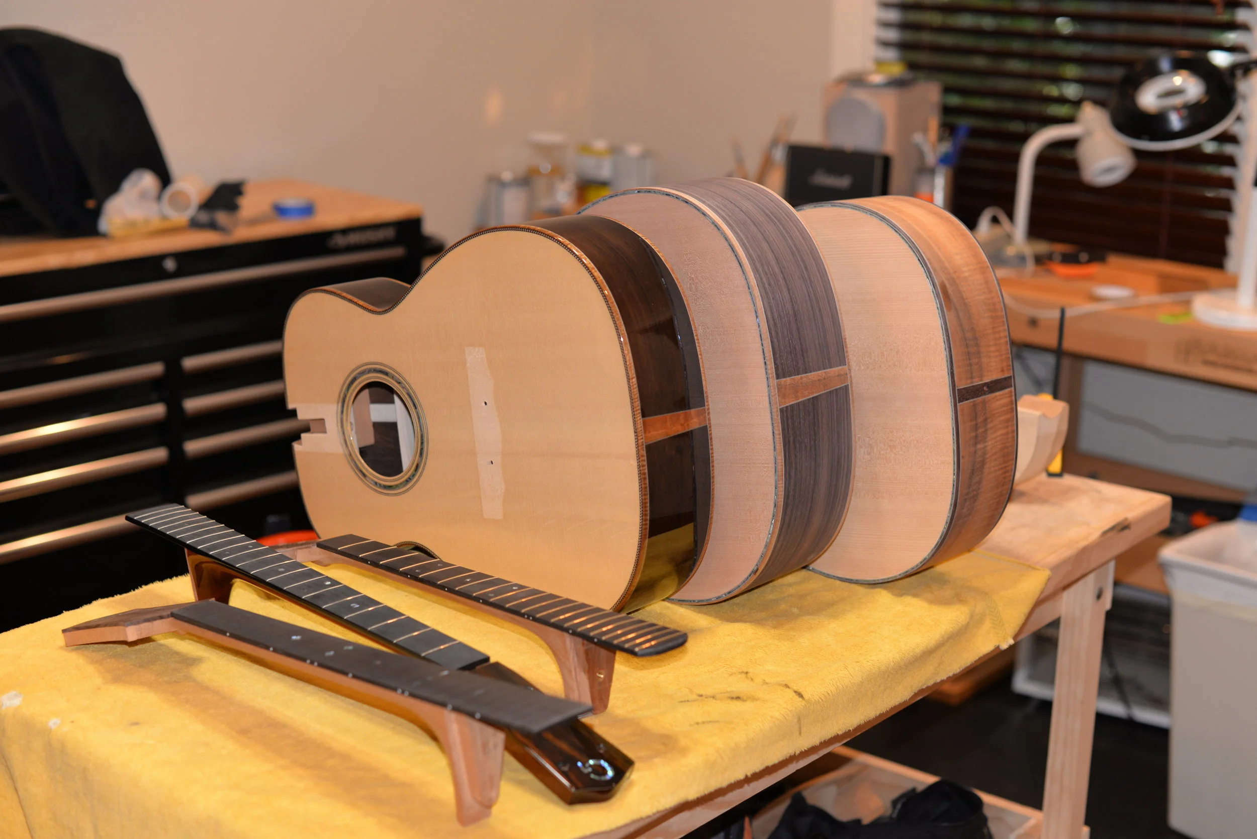In the workshop, Eldon hand crafts most of the guitar parts himself.