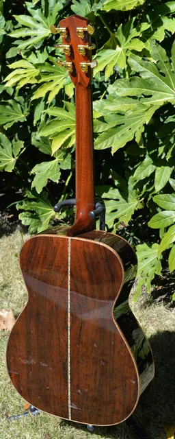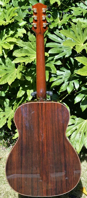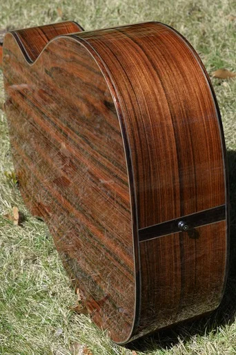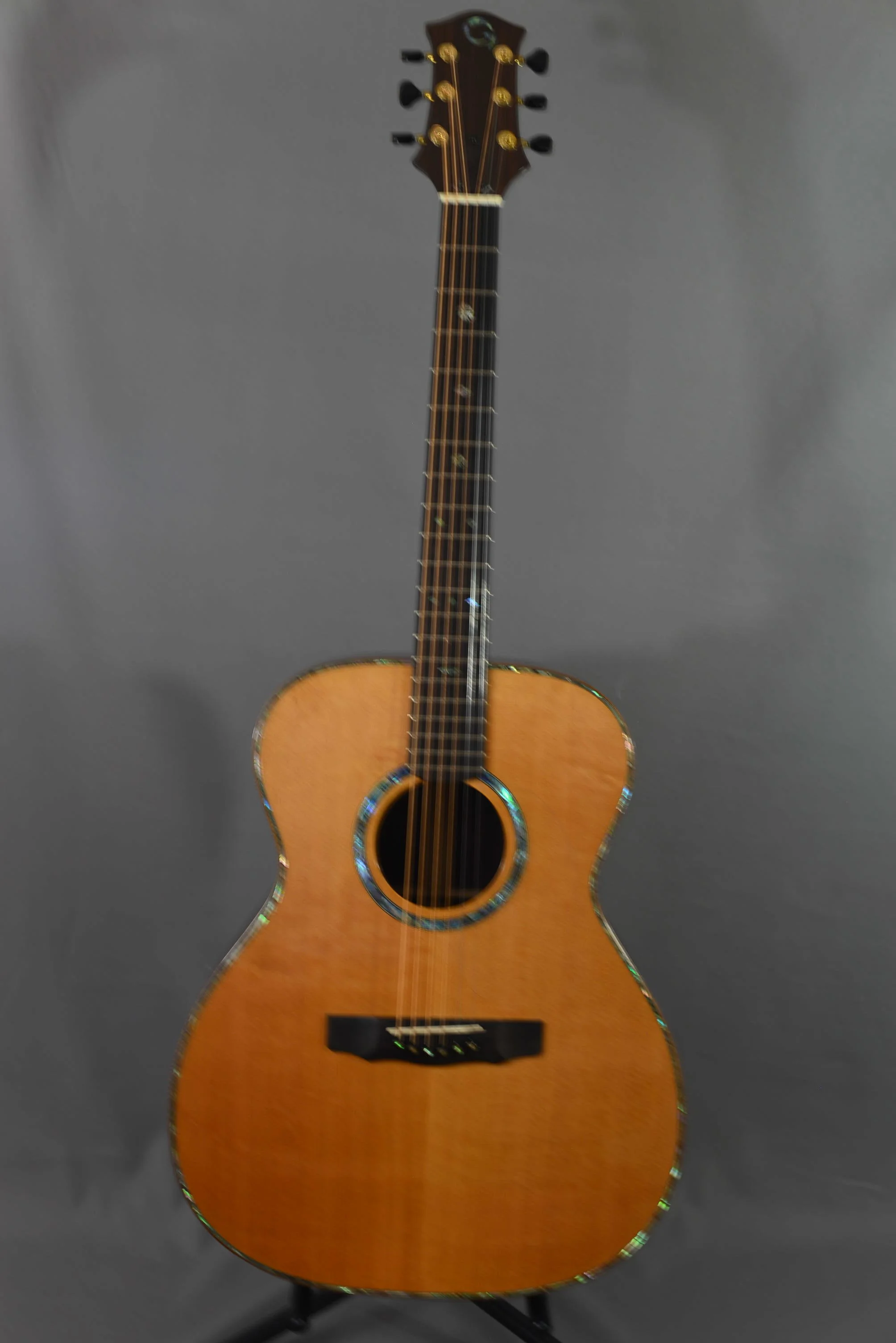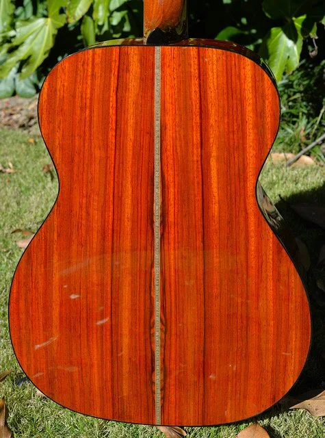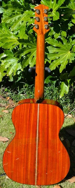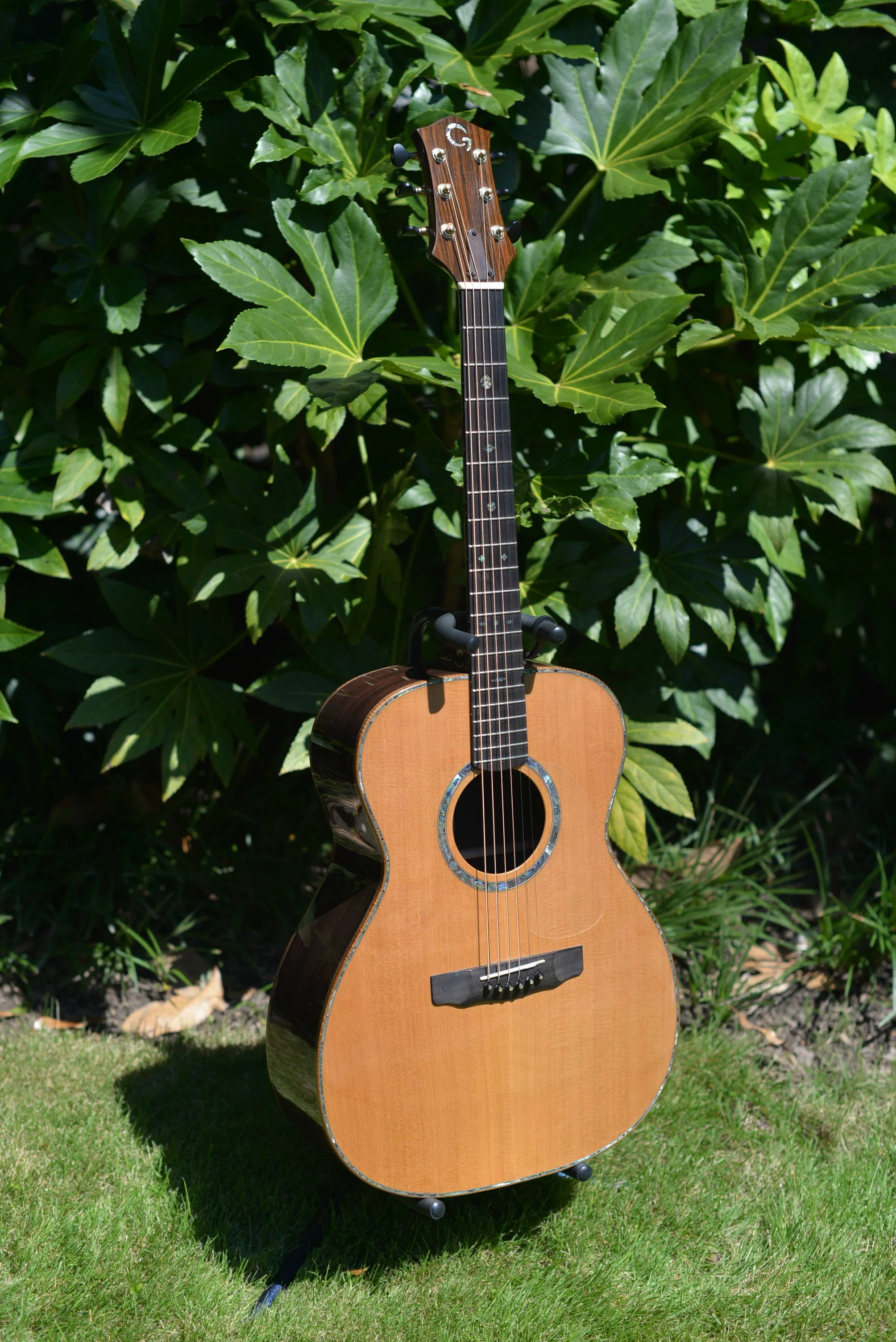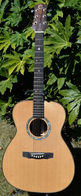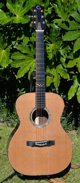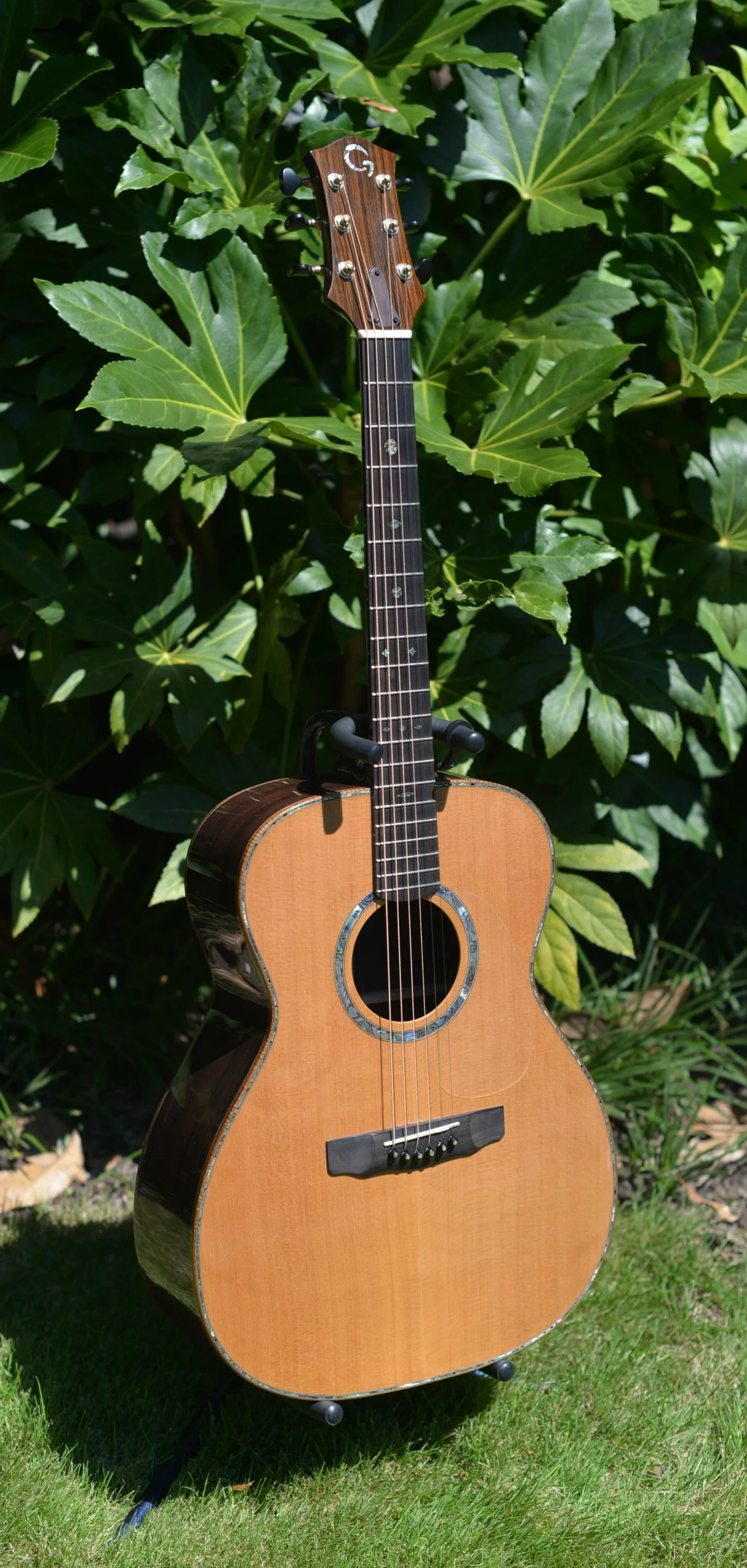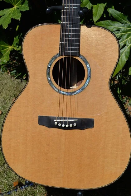 The back and sides are high quality Indian rosewood. The top is western red cedar. Paua abalone make up the fret board markings, rosette and purfling.
