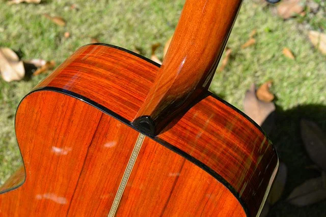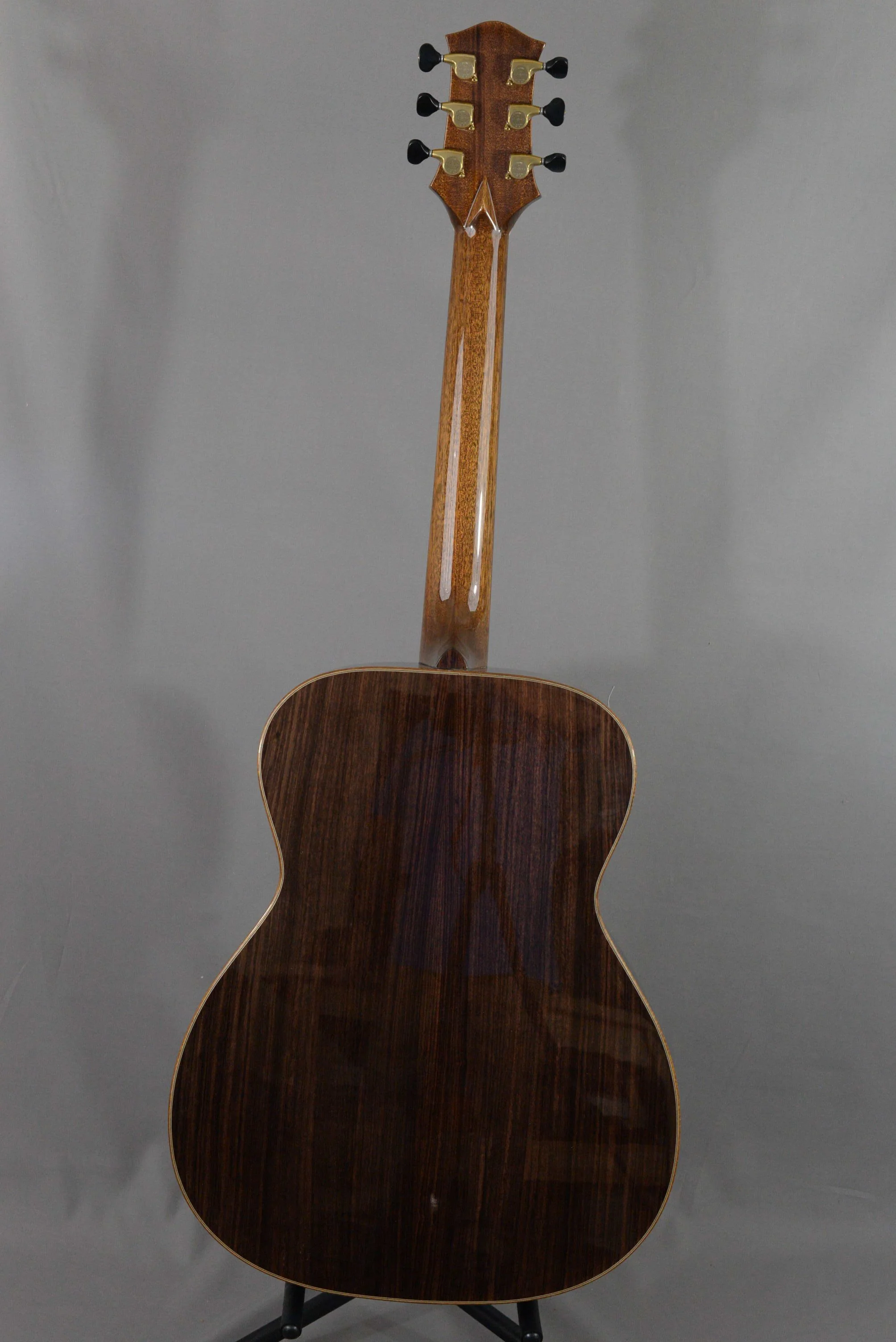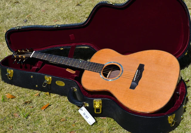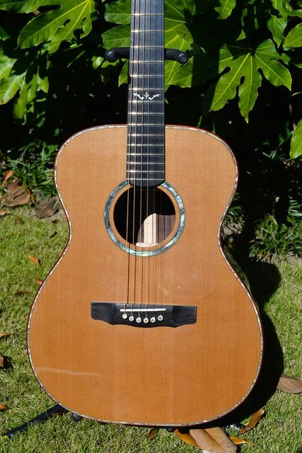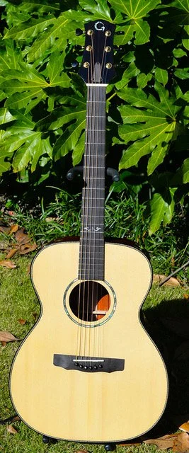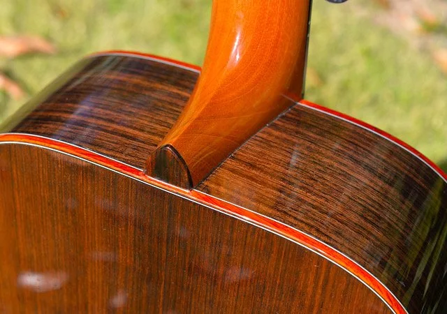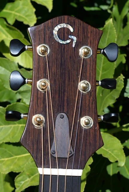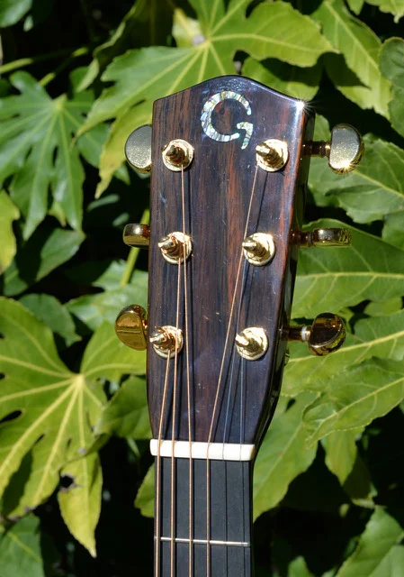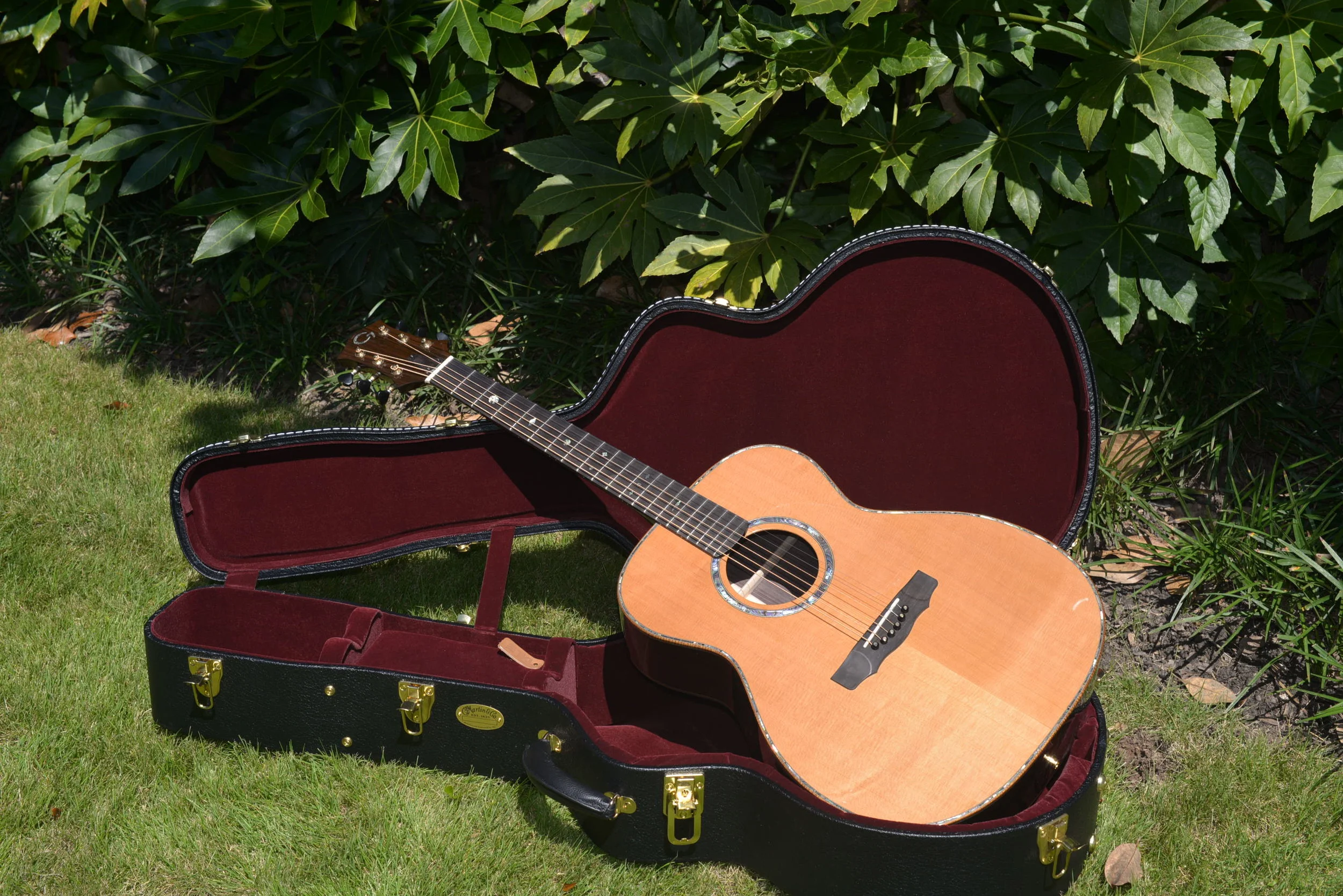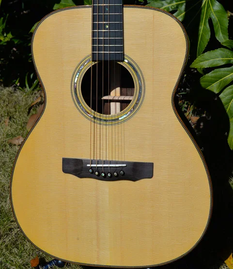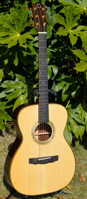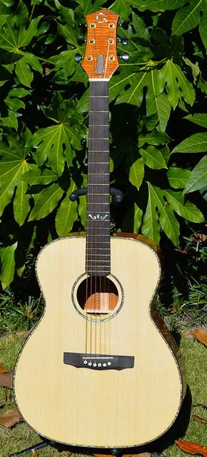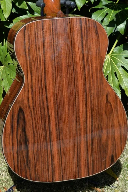 The back and sides are high quality Indian rosewood. The top is western red cedar. Paua abalone make up the fret board markings, rosette and purfling.