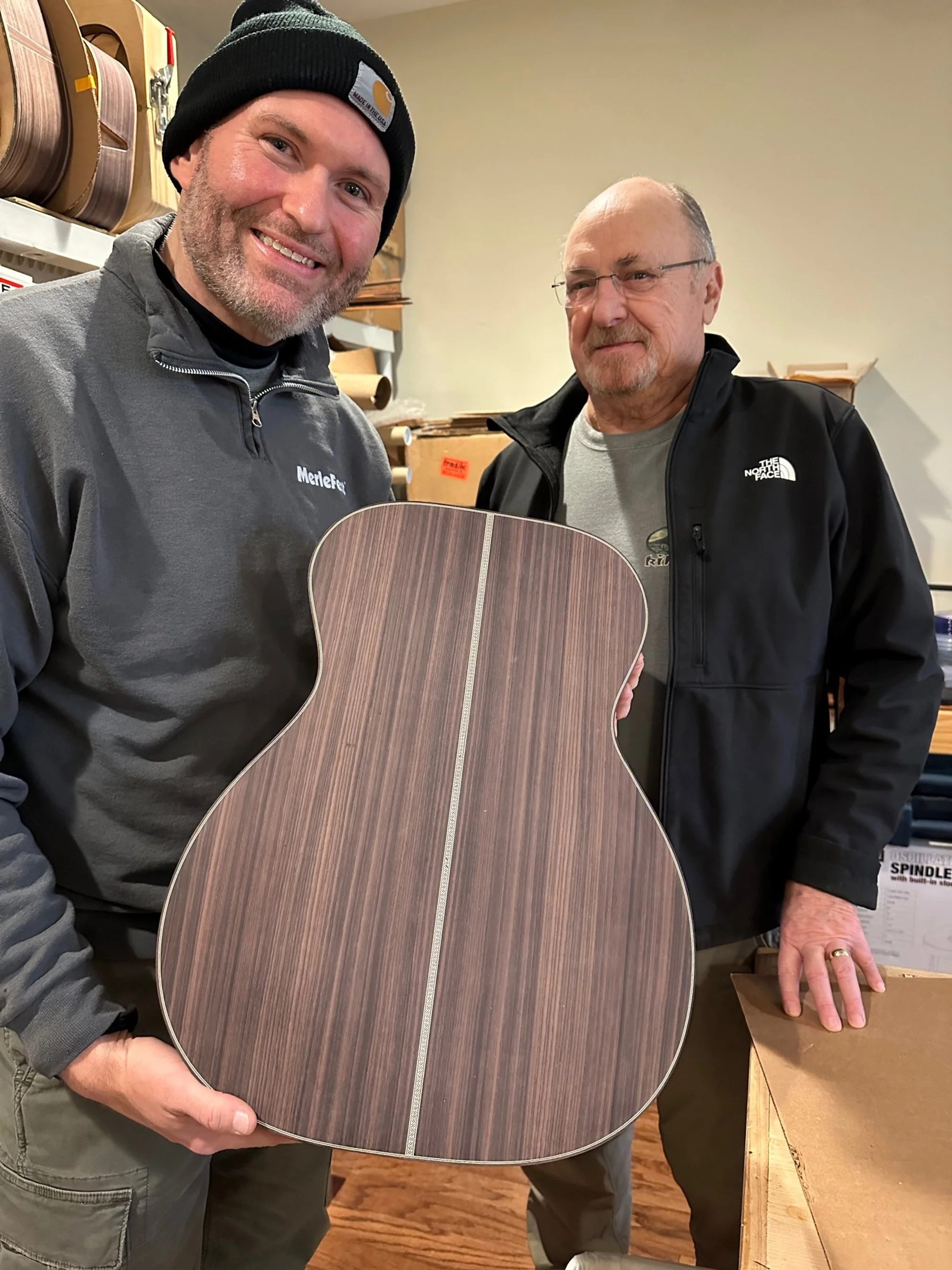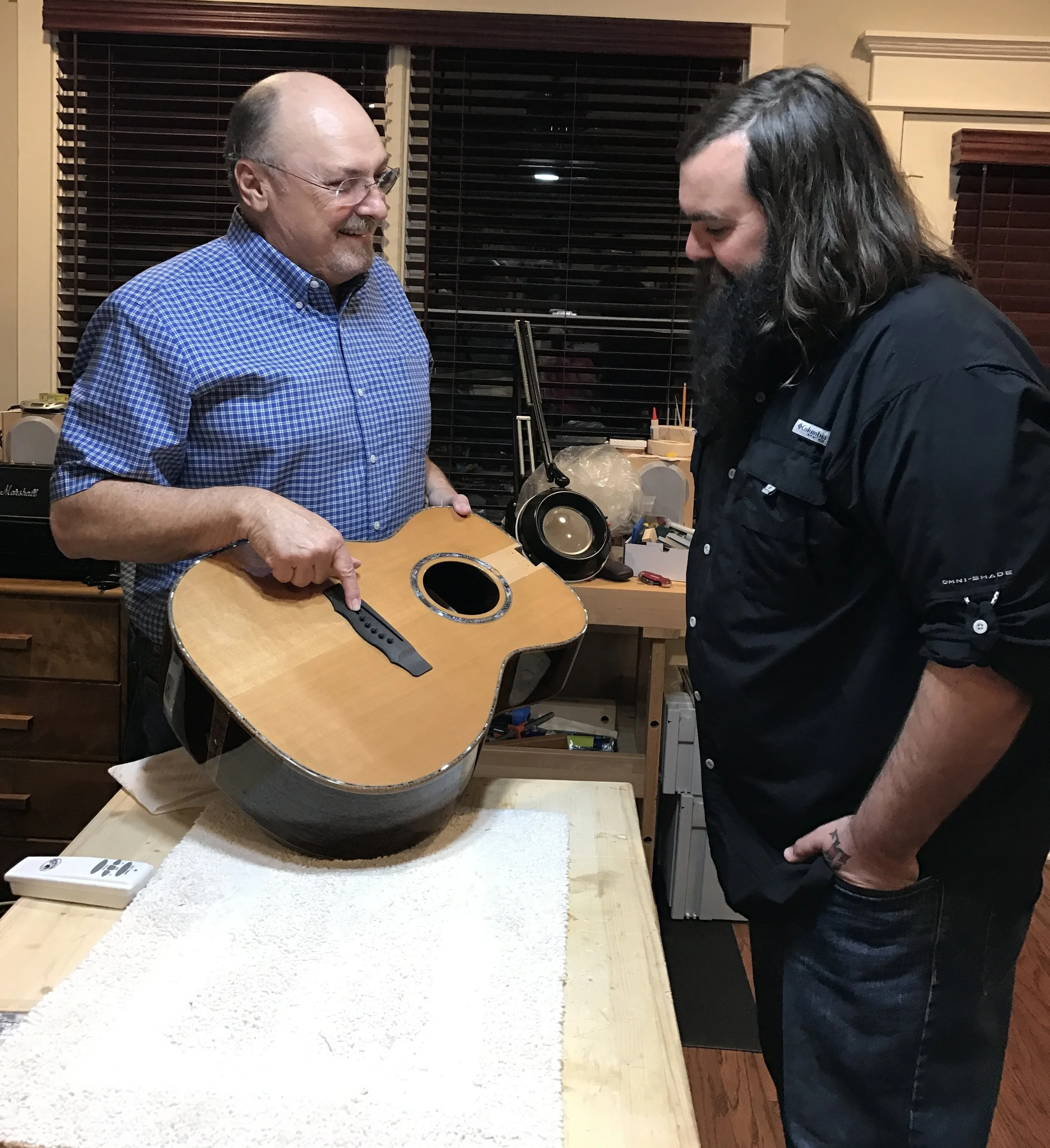 Eldon and Levi Lowrey looking at Levi’s guitar during the building process.